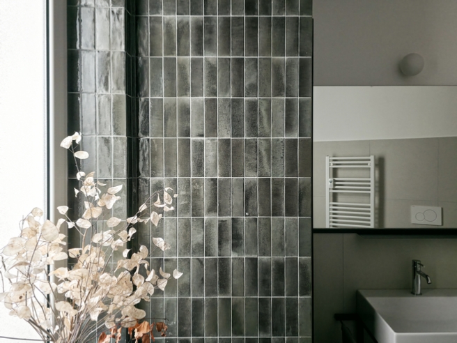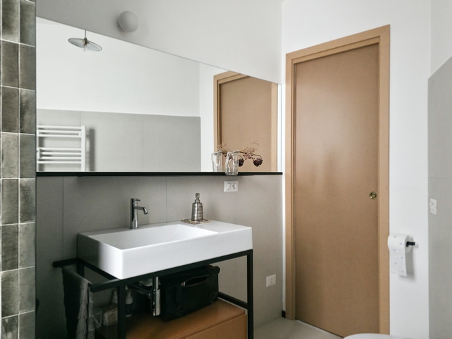 Nello storico quartiere popolare del Quadraro vecchio è stato completamente ripensato un appartamento posizionato all’interno di una palazzina degli anni ’50. I committenti, una coppia di professionisti, ha manifestato la volontà di avere un grande soggiorno, due camere e due bagni. La soluzione adottata prevede la realizzazione di un soggiorno tripartito, con tre finestre rivolte ad est che affacciano su un filare di Ginkgo biloba. Il soggiorno è composto da un primo ambiente dedicato alla zona divano, un secondo spazio riservato alla zona pranzo e alla cucina posizionata in nicchia e infine un terzo spazio adibito a studio. Quest’ultimo può essere separato o connesso agli altri due ambienti della casa tramite una grande parete scorrevole realizzata in acciaio e policarbonato alveolare trasparente. La cucina è realizzata artigianalmente in MDF idrofugo colorato in pasta verde. L’ingresso dell’abitazione è stato ribassato e verniciato con un colore grigio antracite in modo da amplificare la luminosità degli ambienti principali.