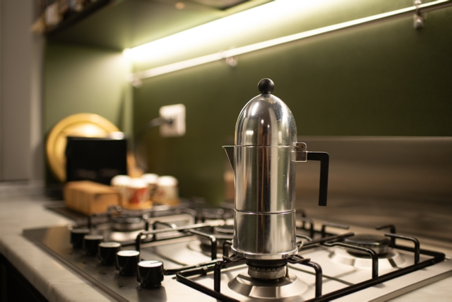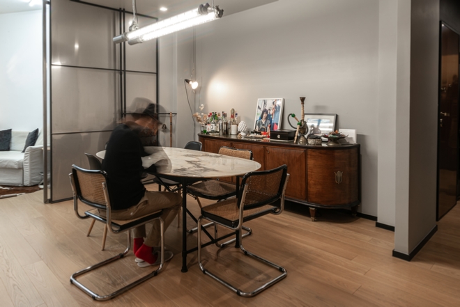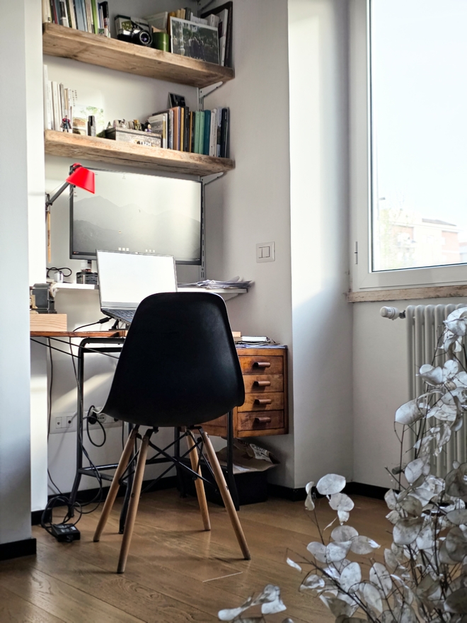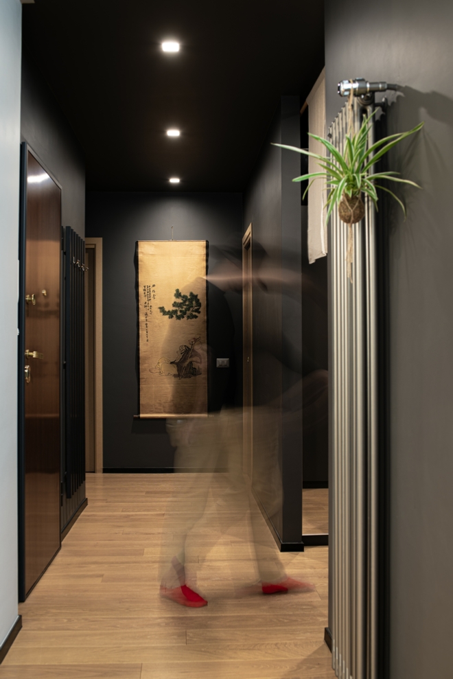 Nello storico quartiere popolare del Quadraro vecchio è stato completamente ripensato un appartamento posizionato all’interno di una palazzina degli anni ’50. I committenti, una coppia di professionisti, ha manifestato la volontà di avere un grande soggiorno, due camere e due bagni. La soluzione adottata prevede la realizzazione di un soggiorno tripartito, con tre finestre rivolte ad est che affacciano su un filare di Ginkgo biloba. Il soggiorno è composto da un primo ambiente dedicato alla zona divano, un secondo spazio riservato alla zona pranzo e alla cucina posizionata in nicchia e infine un terzo spazio adibito a studio. Quest’ultimo può essere separato o connesso agli altri due ambienti della casa tramite una grande parete scorrevole realizzata in acciaio e policarbonato alveolare trasparente. La cucina è realizzata artigianalmente in MDF idrofugo colorato in pasta verde. L’ingresso dell’abitazione è stato ribassato e verniciato con un colore grigio antracite in modo da amplificare la luminosità degli ambienti principali.